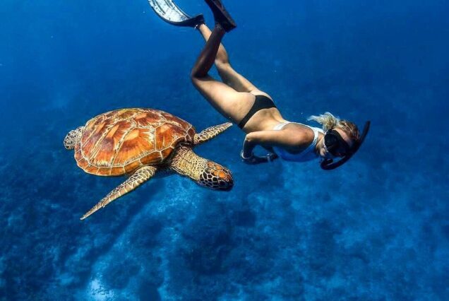 Schwimmen mit Schildkröten: Begegnen Sie majestätischen Karett- und Grünen Meeresschildkröten im klaren, warmen Wasser der Bucht.