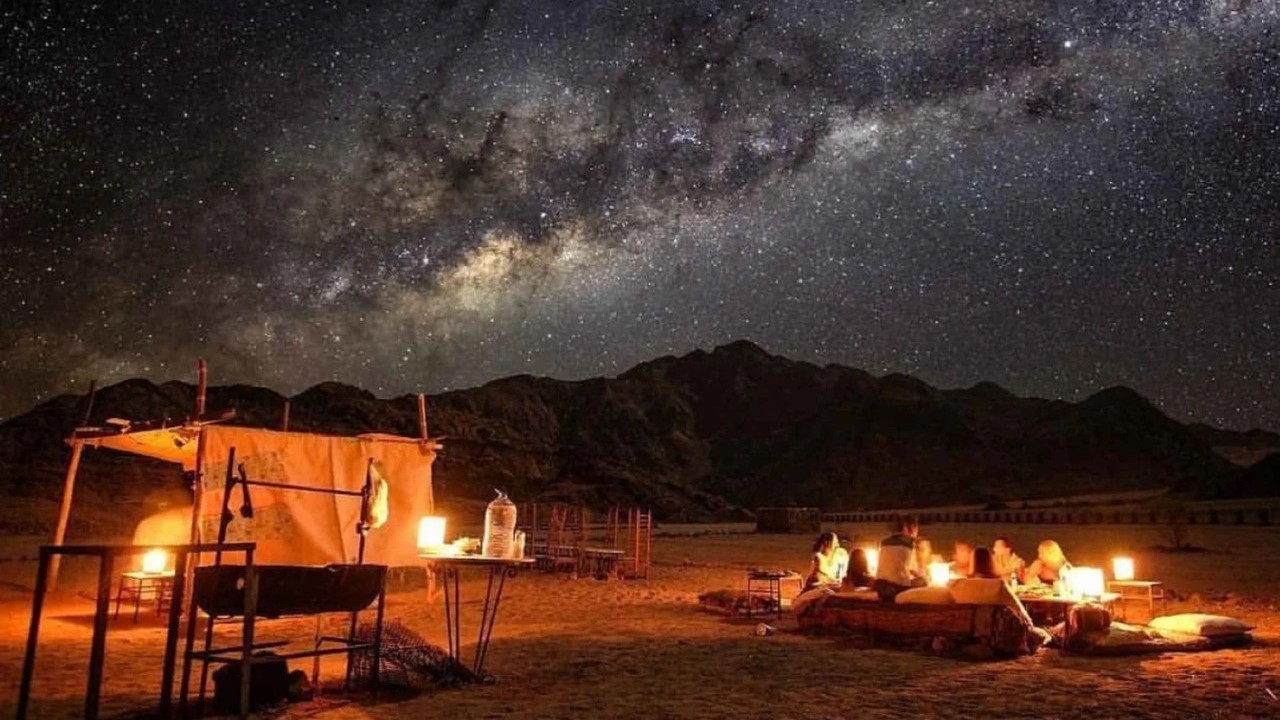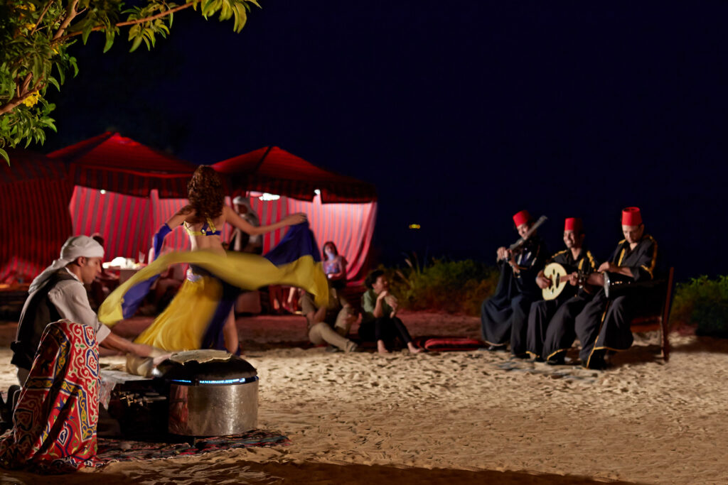 Bei vielen Wüstenausflügen können Touristen ein traditionelles Beduinen-Abendessen erleben – meist unter freiem Himmel, begleitet von Lagerfeuer und Musik.