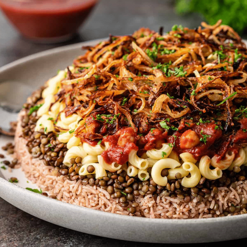Koshari ist die kulinarische Visitenkarte Ägyptens. Eine Mischung aus Reis, Linsen, Nudeln und Kichererbsen, garniert mit knusprigen Zwiebeln und würziger Tomatensoße. Es ist ein günstiges, aber äußerst schmackhaftes Gericht, das man in Restaurants ebenso wie bei Streetfood-Ständen findet.